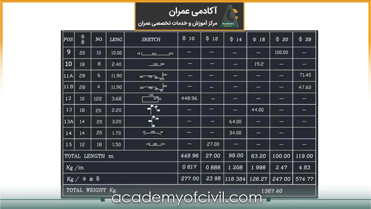 - ستونهای 6 تا 11: در این ستونها تعداد هر سایز میلگرد در مقطع مشخص شده که حاصل ضرب تعداد آرماتور در طول آن است. برای مثال در pos 9 تعداد میلگرد با فی 20 برابر تعداد آن یعنی 10 ضرب در طول هر کدام یعنی 10 متر مساوی 100 متر طول است.